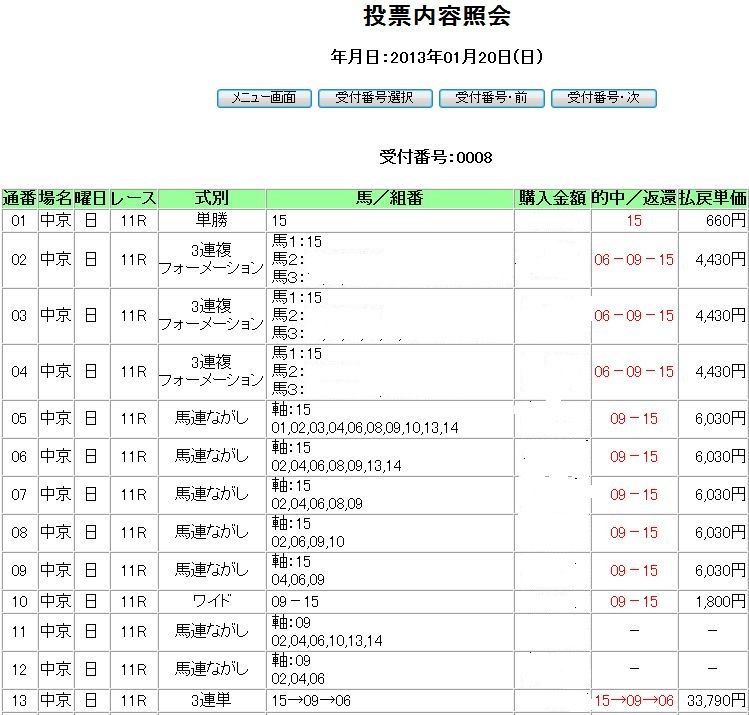 | 京都 | 1位 | 2位 | 3位 | 4位 | 5位 | 6位 | 穴 | 結果 |