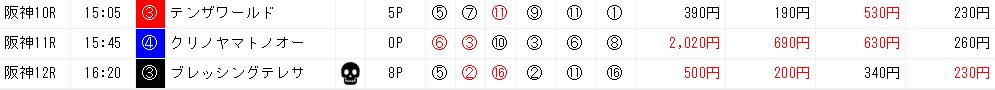 | 阪神 | 1位 | 2位 | 3位 | 4位 | 5位 | 6位 | 穴位 | 3連複万馬券率・配当 | 結果 |