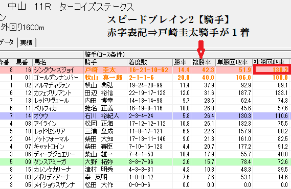 スピードブレイン2【騎手】より(複勝率42.3% 複勝回収率130.2%)